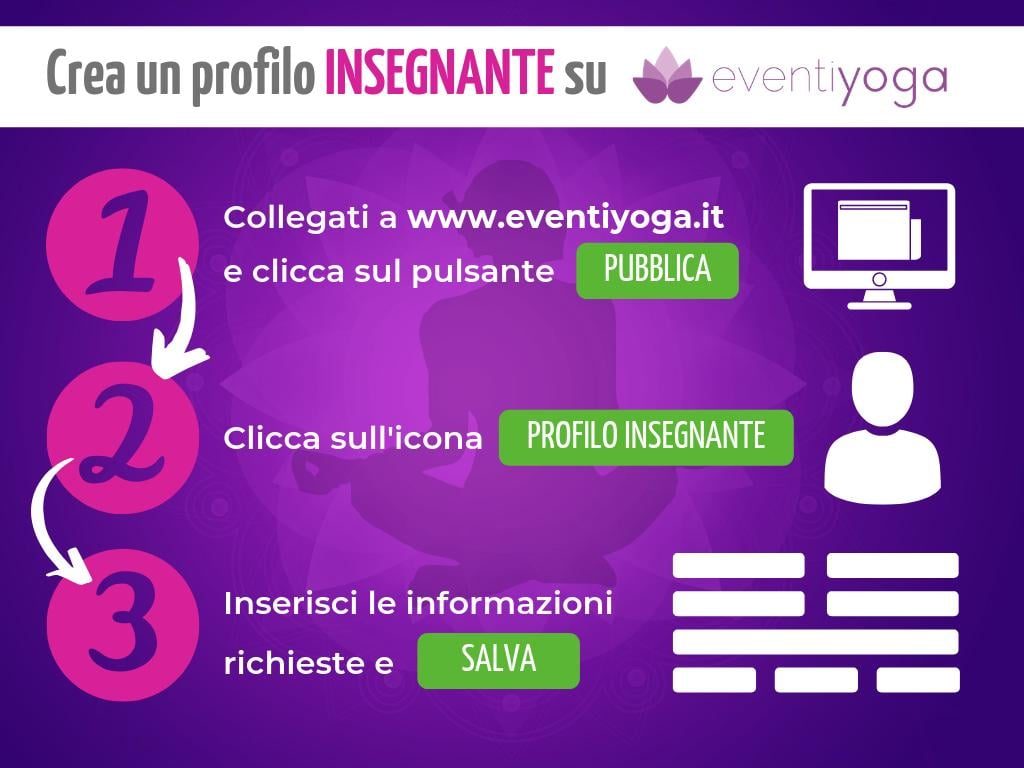E se non lo hai ancora fatto, pubblica il tuo profilo nella sezione Insegnanti. Non sai come fare? Eccoti una guida utile su come pubblicare il profilo insegnante su EventiYoga.