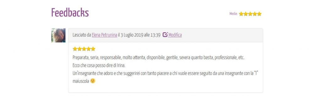 Ecco qui, a titolo di esempio, una recensione lasciata a una delle insegnanti iscritte al nostro portale, Irina Mirankova: