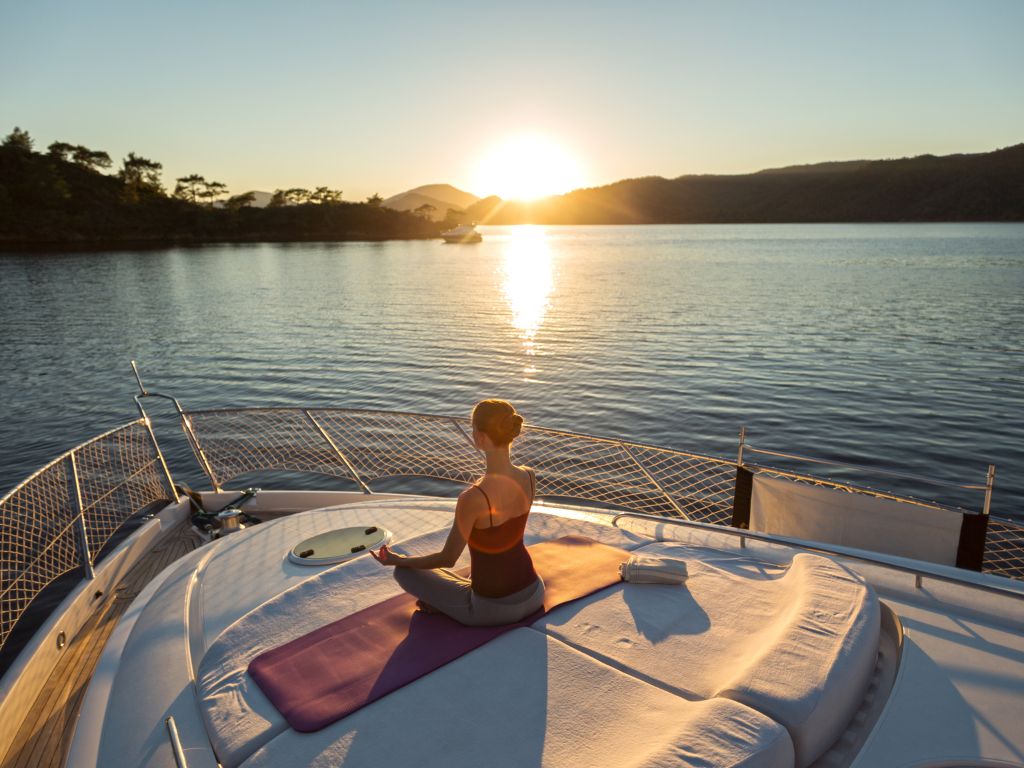 donna pratica yoga al tramonto in barca