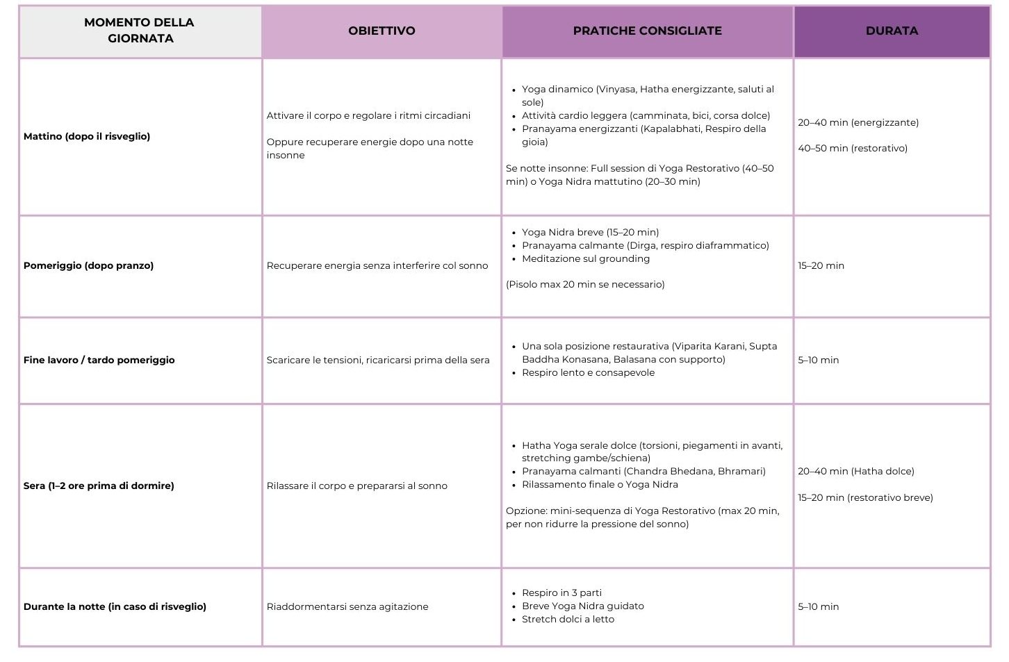 Attenzione anche a pratiche yoga serali troppo rilassanti (es. 1h di restorative): potrebbero ridurre la pressione del sonno. Meglio limitarle a 20-30 minuti.